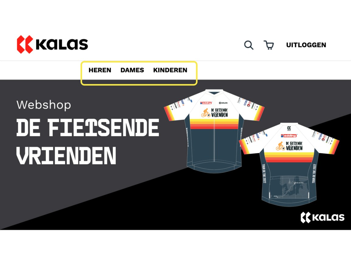 Ga vervolgens naar de menu items (HEREN, DAMES, KINDEREN) linksboven in de hoek (zie afbeelding hierboven). Er verschijnt een uitklapmenu waarin je jouw keuze kunt aangeven. Let op: In de webshop zie je kleding met een neutraal design. Maar je bestelt dus wel de kleding in het enige echte De Fietsende Vrienden design.