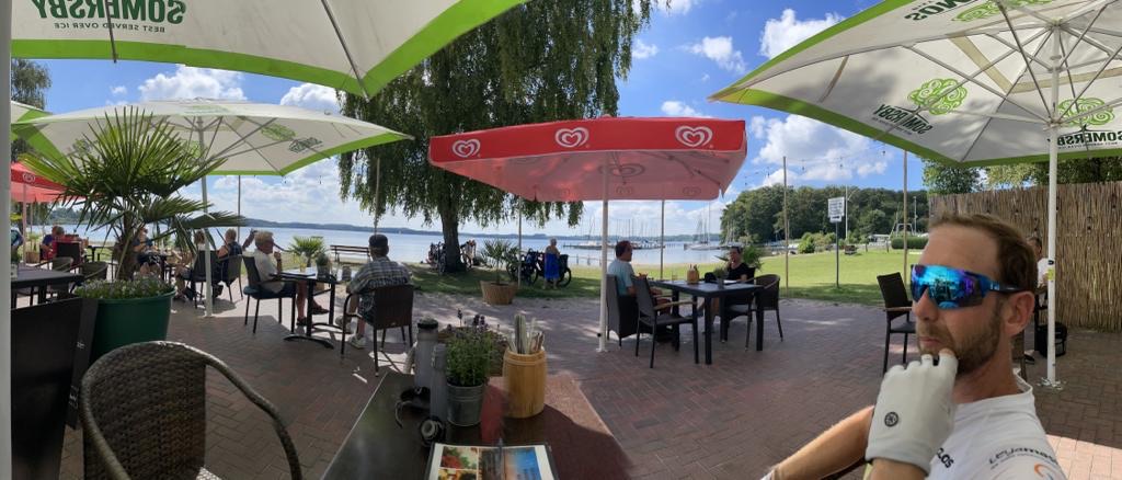 Age rijdt terug naar Ahrensburg, waar de jongens de rit naar Heiligenhafen voortzetten. Daar waar Age terug bij edding nog wat werkzaamheden verricht, fietsen Arjan, Richard en Robert door mooie natuur en prima fietspaden. De heren zijn het er over eens dat dit de mooiste route tot nu toe is. Glooiende heuvels met slingerde wegen door afgelegen gebieden waar nauwlijks ander verkeer aanwezig is. Een genot voor het oog. Plots doemt er een prachtig meer op. Het blijkt de Grosser Plöner See te zijn. In Bosau, dat aan dit meer ligt, wordt een lang uitgestelde, dus welkome lunch gegeten.