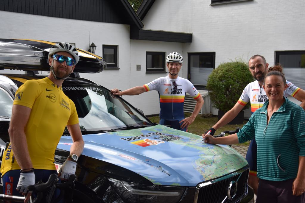Het tempo lag op het eind van de koers zo hoog dat de drie renners te snel voor de bezemwagen bleken te zijn. De fietsende helden kwamen zelfs ruimschoots eerder aan bij Hotel Sleep2Night aan als hun soigneur alias ploegleider Age. Die had ‘in de bus’ overigens wel goed nieuws: “We zitten al bijna op € 11.000,– euro aan donatiegeld voor het goede doel (gaan we het streefbedrag van € 12.500,- halen?). En er is een bod van maar liefst € 500,- gedaan op het gesigneerde De Fietsende Vrienden shirt. Chapeau! Nog zo’n positieve dagafsluiter: Arjan mag natuurlijk zijn gele trui behouden!