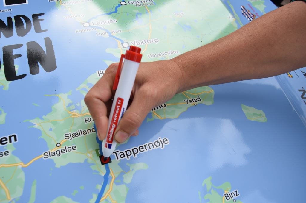 Helsingør, 28 augustus 2022 – Voor het eerst in de geschiedenis van de Tour De TBE start deze in Denemarken. Het land van wielerheld Jonas Vingegaard. Nog voordat er een kilometer gereden is, wordt er al een belangrijke taak vervuld: Het aftekenen van Tappernøje op onze motorkap. Heel voorzichtig zien we een traantje van geluk bij Sharon Pedersen als we haar vragen dit voor ons te doen.