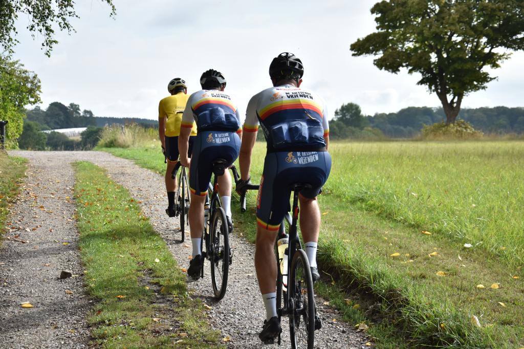 Niet veel later wordt het gat met gestrekt tempo door Richard en Robert met de grote molen dichtgereden en fietsen de helden gedrieën verder. Dat De Fietsende Vrienden een geweldige ploeg is, blijkt ook uit het enige incident van vandaag. Geletruidrager Arjan reed lek.