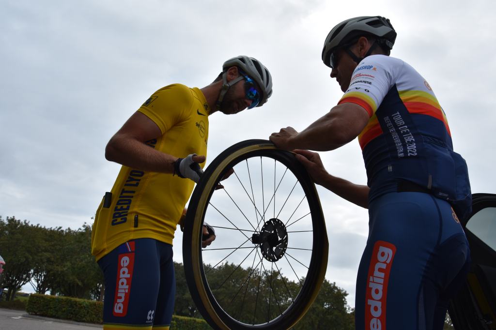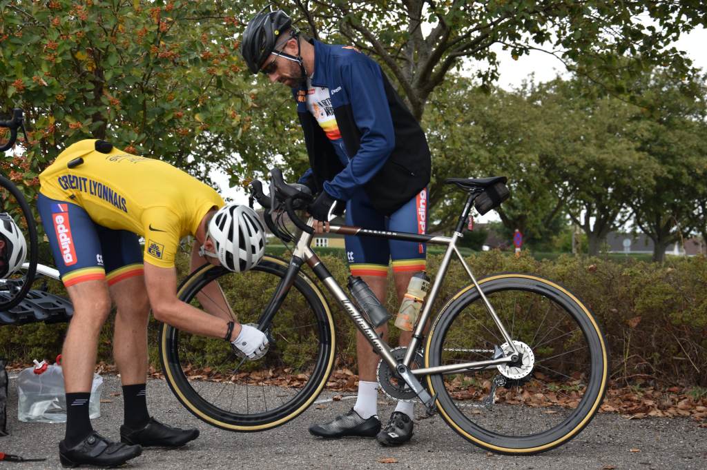 Gelukkig voor hem precies op de plek waar was afgesproken om te gaan lunchen, want je rijdt de Tour de TBE niet op alleen een ochtendboterham met pindakaas. Dat betekent dus dat de volgauto, met alle fietsonderdelen, ook ter plekke is. Meesterknecht Robert schiet Arjan snel te hulp. “Naast vrienden voor het leven zijn we tevens de beste ploeggenoten ter wereld. We gaan voor elkaar door het vuur. Bij een lekke band van de één staan de kameraden direct voor de ander klaar om helpen. Zo kan er in iedere situatie weer doorgereden worden”, aldus Robert.