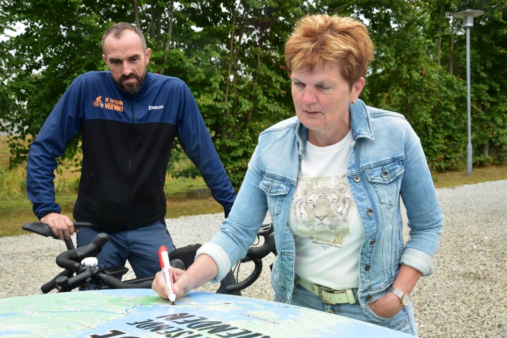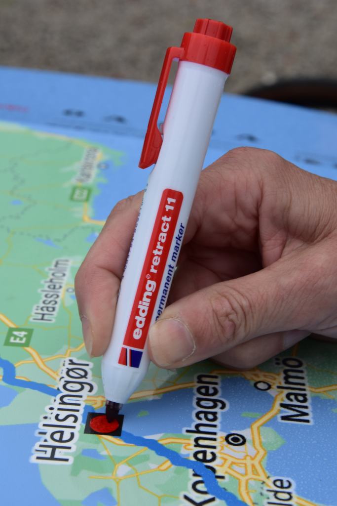 Terug naar de waan van deze dag. De achtste rit dient zich aan en we moeten nog ontbijten en Helsingør aftekenen. Als we de bammetjes hebben opgegeten, is het tijd om de auto in te pakken. Deze routineklus gaat lekker vlug, dus al snel kunnen we beginnen met het volgende terugkerende klusje, het aftekenen van de plaats die we achter ons laten. Maar wie moet dat hier doen? Dan staat er plots een Nederlands stel bij de auto. Onze bolide viel hen op, evenals het feit dat wij allemaal hetzelfde trainingsjasje aan hadden. Waar we mee bezig zijn? We steken van wal en geven tekst en uitleg. Het stel blijkt onder de indruk. Dan vraagt Robert of zij het aftekenen voor ons willen verzorgen. Prima ingeving. Zo gezegd, zo gedaan. Mirjan van Bommel, zo heet de vrouw van het stel, wil deze belangrijke rol wel vervullen. Ze doet het met liefde en verve: