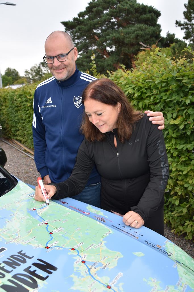 Vandaag tekent Arjen Bouterse Norrköping af op onze motorkap. Het is inmiddels een ochtendritueel geworden. Statief op de juiste plek neerzetten. Camera erop plaatsen. Proeffoto maken voor de belichting. Dan iedereen neerzetten op de juiste positie. Timer instellen op de camera. Knopje indrukken en dan vervolgens naar de groep lopen, zodat ikzelf ook op de foto kom. Vervolgens in de camera kijken. Klik, Teruglopen naar de camera. Foto checken. Nog één op dezelfde manier maken, maar dan dicherbij. Tot slot met de camera in de hand de detailfoto’s schieten. Arjen en zijn vrouw Johanna laten het allemaal over zich heenkomen en tekenen Norrköping op een professionele manier af.