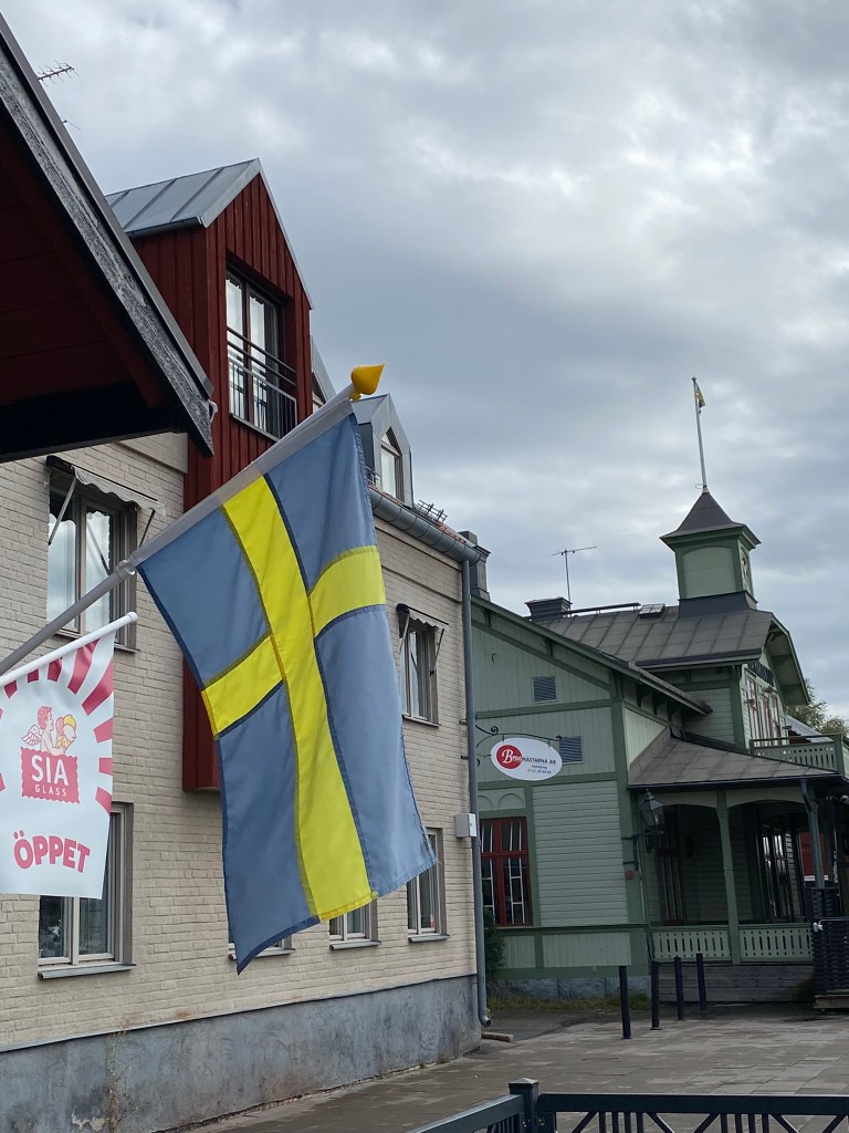 Ook bij de aanlegplaats een Nederlandse vlag, dit maal vergezeld met een Zweedse. We laden eerst de fietsen uit en daarna alle tassen en koffers. Die worden in een soort van bolderkar gemoduleerd. Wij nemen onze fietsen mee naar het appartement. Maaike en Ingor sjouwen de bolderkarren naar onze slaapplek. Deze korte wandeling maakt één ding goed duidelijk: Sävö is spectaculair!