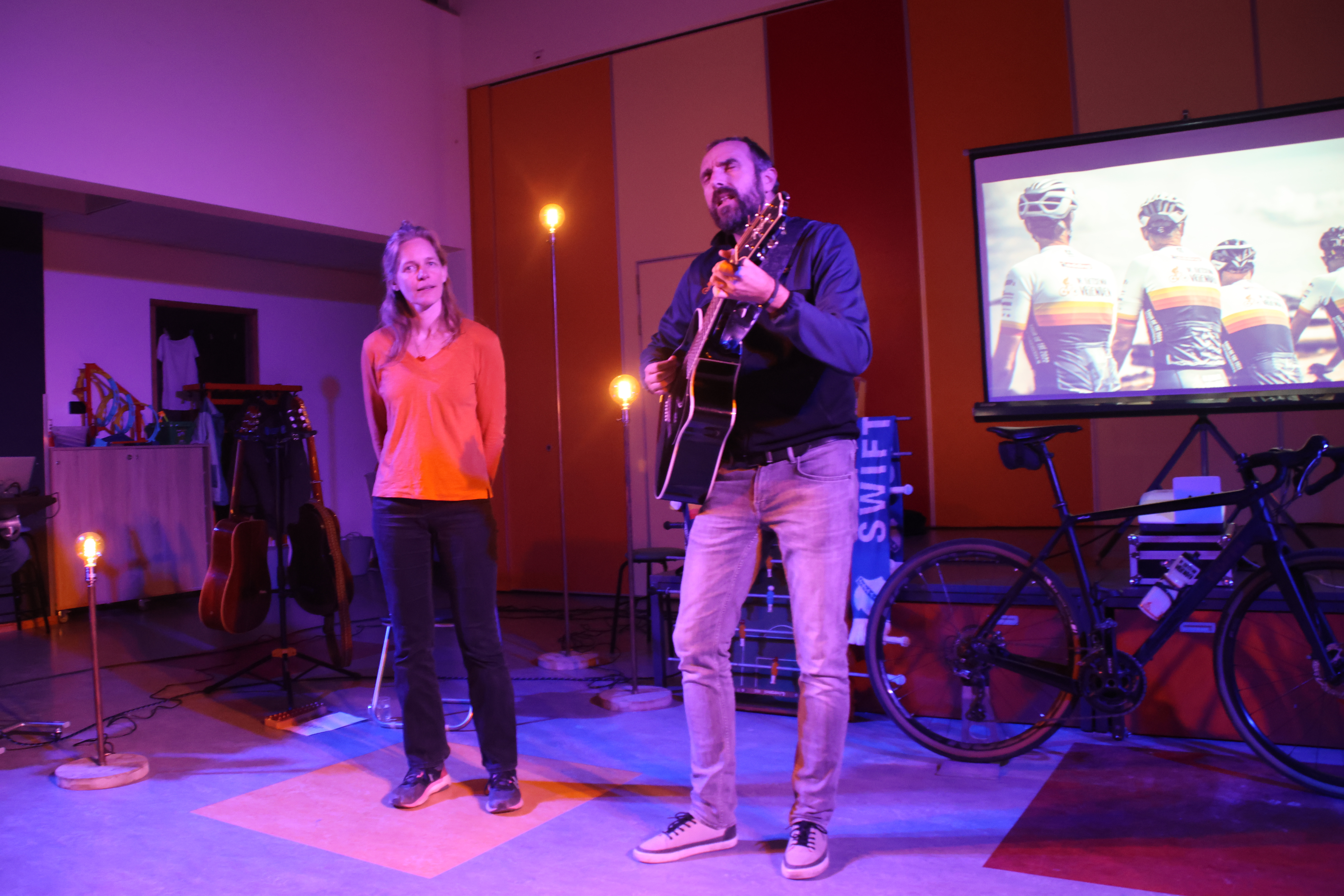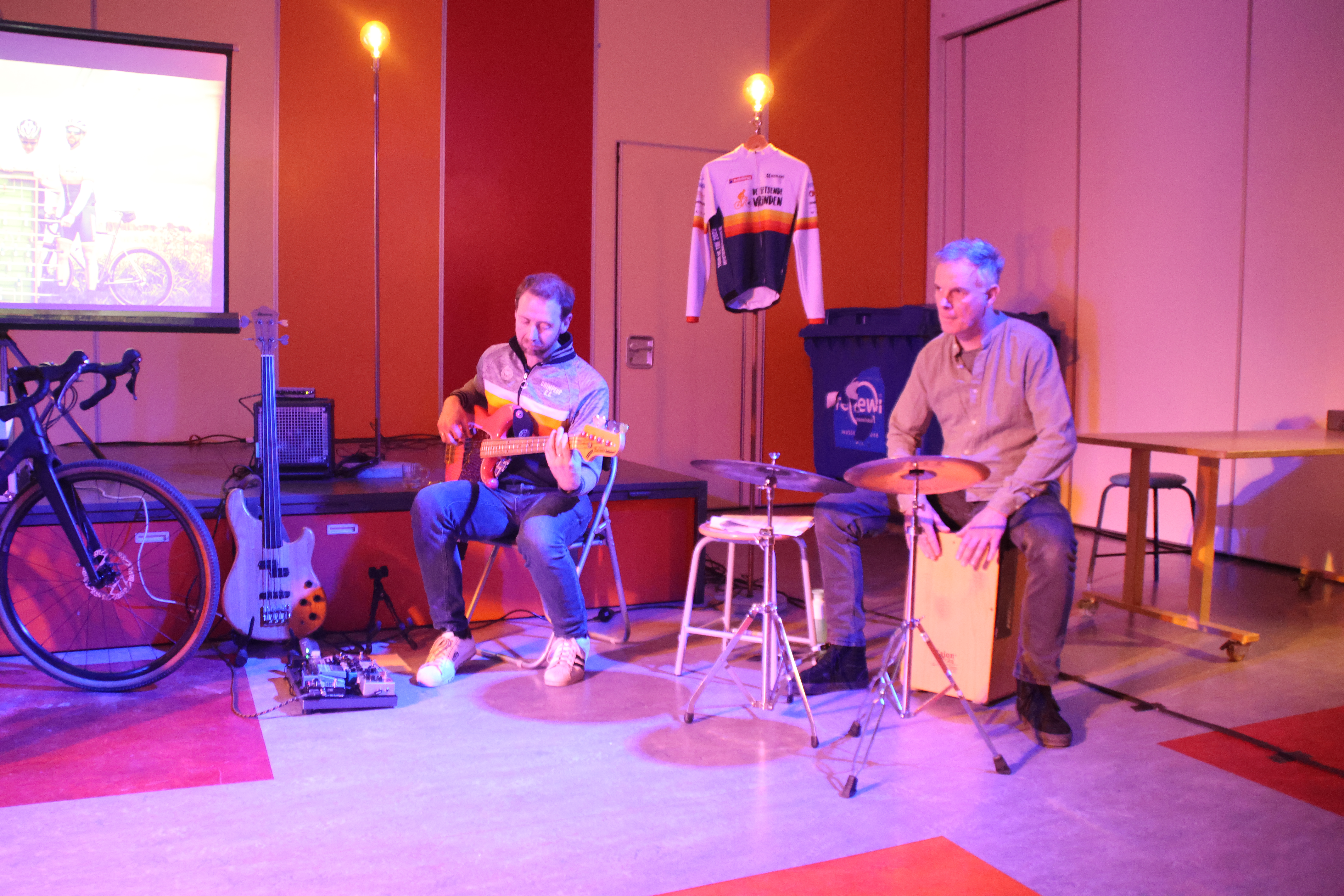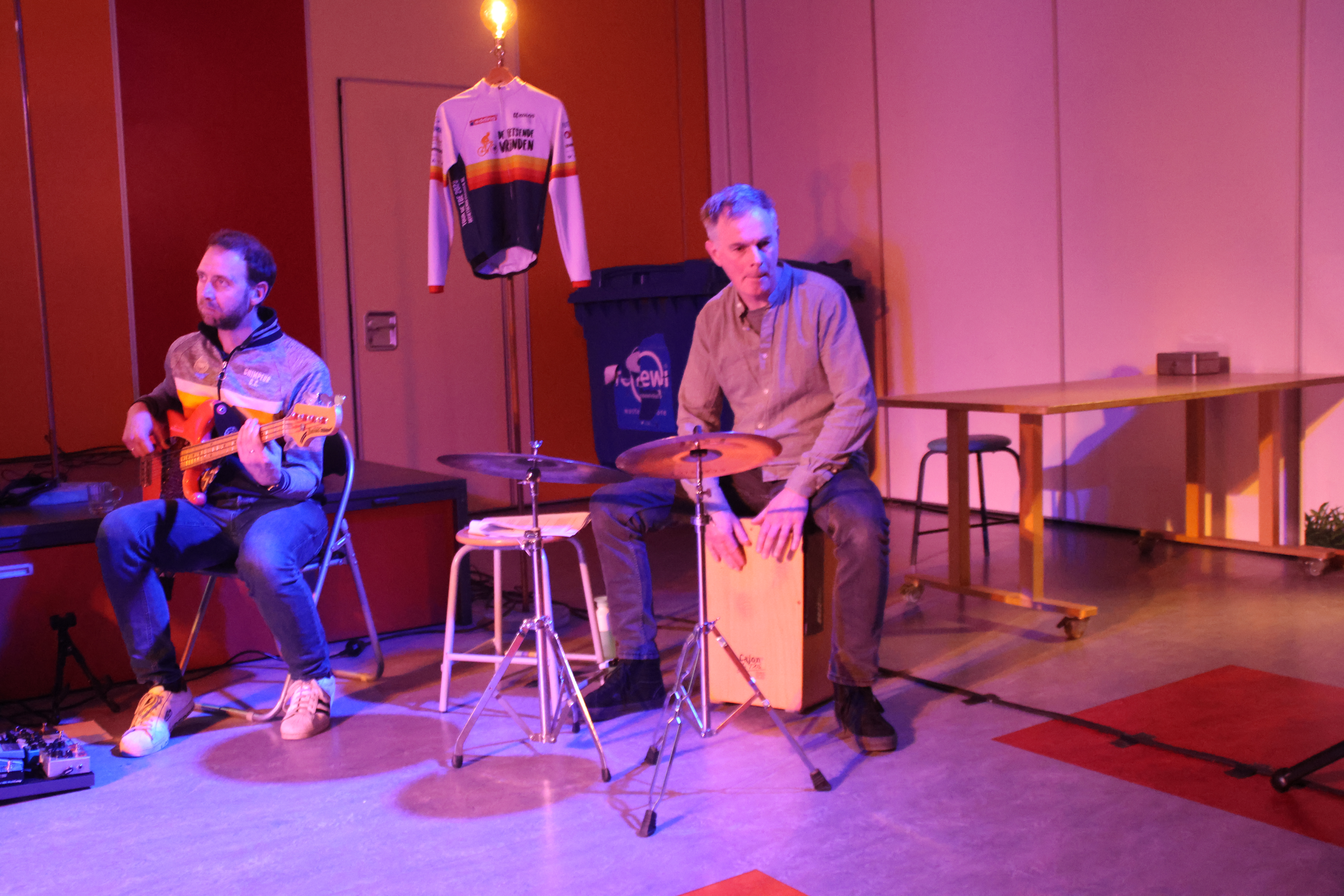 Hoewel onze gewaardeerde ploegleider Age Yska er niet bij kon zijn, hebben we zijn aanwezigheid in gedachten gevierd. Zijn herstel gaat voor, en we wensen hem alle kracht toe. Richard Drenth, een ware vriend op de fiets, nam Age’s rol over met een flair die ons allemaal trots maakte. Verder aanwezig waren naast theatermaker Robert Baarda onze kopman Arjan van Egmond op basgitaar, Hugo Hendrickx op percussie en Linda Evenhuis op gitaar. Zij verzorgde ook de tweede stem tijdens de door Robert gezongen liedjes.