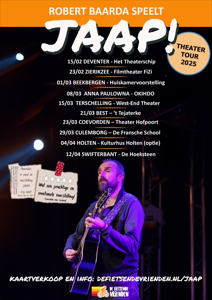 Dus, laat je raken door het verhaal van JAAP! in 2025. Dit is jouw kans. Wacht niet langer. De speellijst en tickets vind je op defietsendevrienden.nl/jaap. Kies je datum en plaats.
