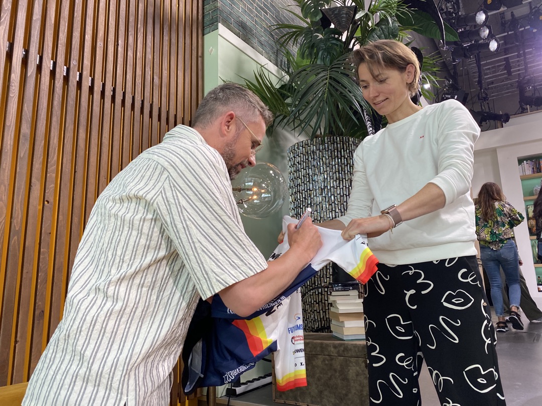 Er is maar één gesigneerd De Fietsende Vrienden shirt in de wereld. En dat shirt kan jouw shirt worden. Wie kan er nog meer zeggen dat ze een wielershirt hebben waar vele bekende Nederlanders hun handtekening op hebben gezet? Niemand… Maar jij straks wel!